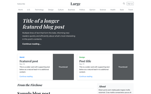 雜誌風格的部落格範本,具有頁首、導覽、精選內容。